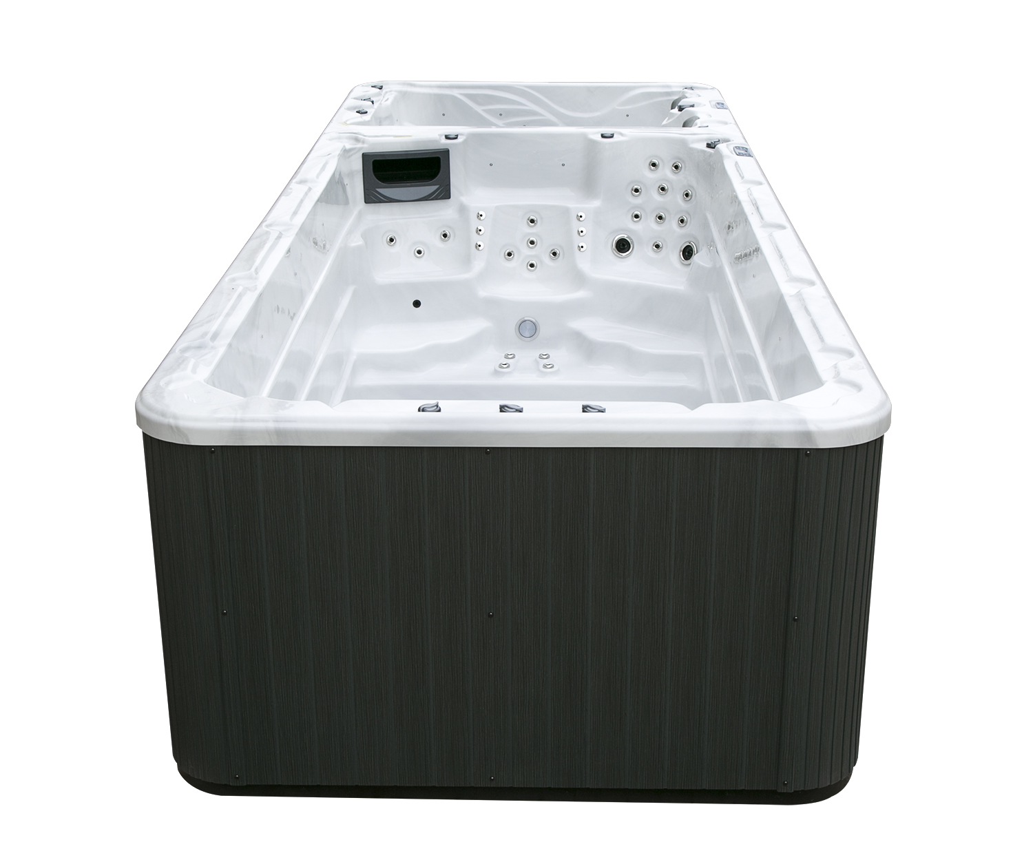 Два гидромассажных насоса по 1,5 кВт в сочетании с 76 форсунками обеспечивают интенсивный массаж и эффективную гидродинамику в спа-зоне. Мощный водяной насос на 2,9 кВт и форсунки противотока нового поколения создают идеальные условия для занятий плаванием и тренировок на воде в основной части бассейна.